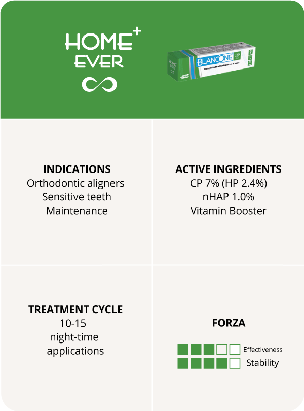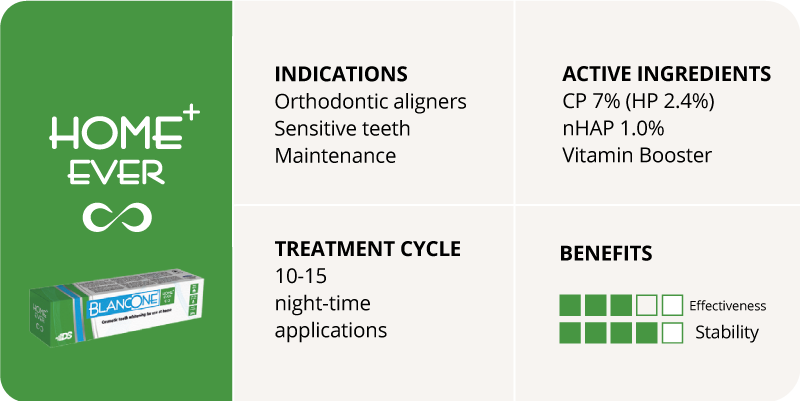 BlancOne HOME+ EVER is the Tooth Rejuvenation treatment which works alongside orthodontic treatments breaking up the biofilm, restructuring the enamel, eliminating sensitivity and preventing tooth yellowing.