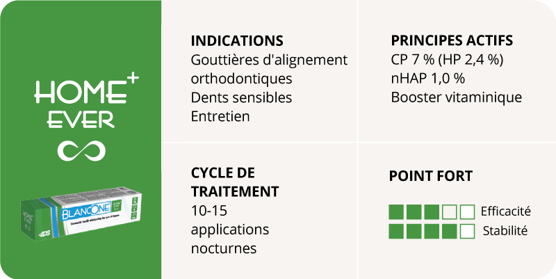 Grâce à BlancOne HOME+ EVER, le traitement d’éclaircissement à domicile adapté à ceux qui suivent un traitement d’orthodontie avec des gouttières d'alignement invisibles, les patients ne devront plus renoncer à l'éclaircissement et pourront utiliser les mêmes gouttières que celles du traitement d’orthodontie.
