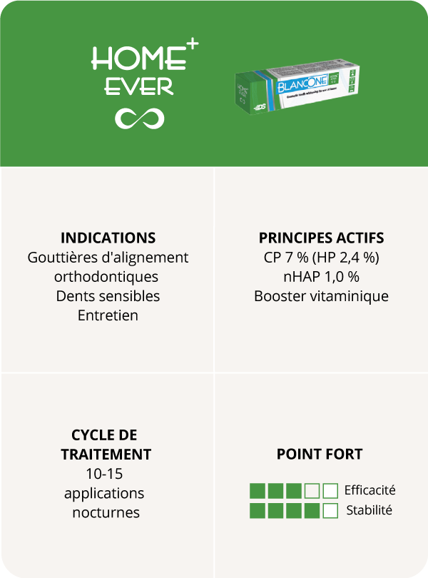 BlancOne HOME+ EVER est le traitement de Tooth Rejuvenation qui complète la thérapie d’orthodontie en décomposant le biofilm, en restructurant l'émail, en éliminant la sensibilité et en prévenant le jaunissement des dents.