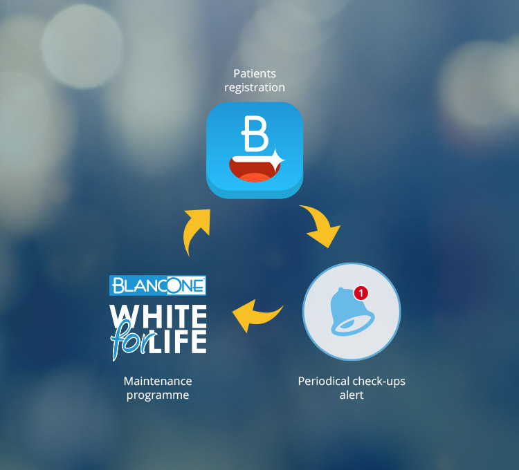 - At the end of the treatment you will be able to combine the maintenance programme Xtra, and, by comparing information on the treatment with the patient’s habits, the app will suggest when the next check-up visit should be performed. The BlancOne PRO app will invite your patients for their next check-up visit at your Centre, by sending an email automatically.